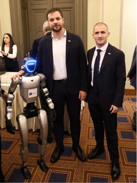 Tibor Kapu and Gyula Cserényi with a humanoid robot. Photo: Judit Sárai, njszt.hu